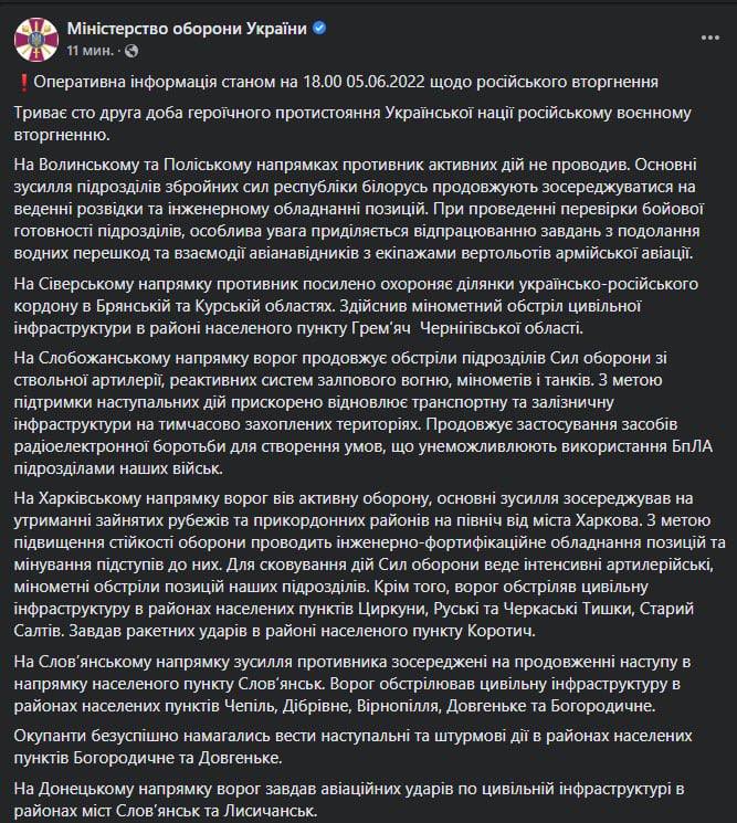 08:00 Сводка Генштаба ВСУ на утро 5 июня. Ключевые моменты: