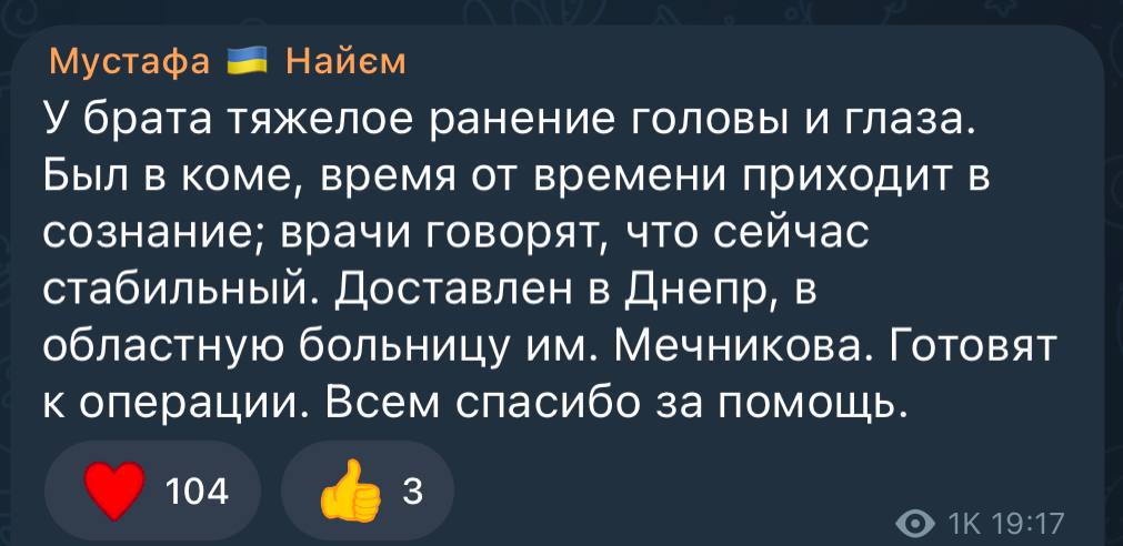 "У брата тяжелое ранение головы и глаза. Был в коме, время от времени приходит в сознание; врачи говорят, что сейчас стабильный. Доставлен в Днепр, в областную больницу им. Мечникова. Готовят к операции. Всем спасибо за помощь", - написал Мустафа.