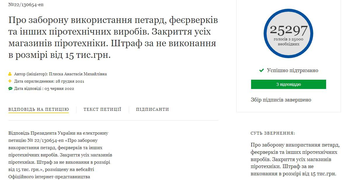 "Поддерживаю обеспокоенность по поводу увеличения опасных последствий в связи с использованием разнообразных пиротехнических изделий в повседневном быту и считаю, что их потребление во время военного положения должно быть четко урегулировано на законодательном уровне", - написал в ответе Зеленский.