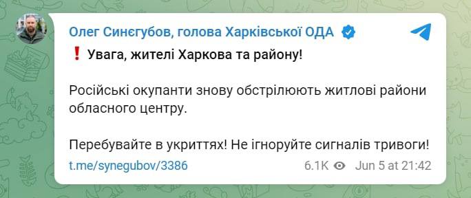 21.49 Глава Харьковской ОВА Олег Синегубов подтвердил удар по Харькову.