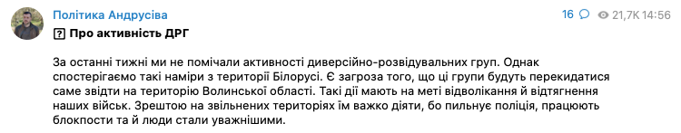 Советник главы Министерства внутренних дел Виктор Андрусив заявил, что Россия может забросить свои диверсионно-разведывательные группы в Волынскую область из Беларуси, чтобы отвлечь ВСУ.