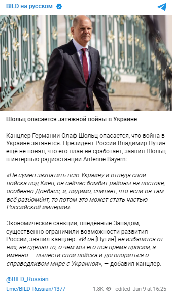 Напомним, сегодня Путин заявил, Россия будет расширять свою территорию. Тем временем Украина может получить от Германии обещанное Шольцем ракетное оружие только к зиме. А генсек НАТО Столтенберг внезапно передумал ехать сегодня в Берлин.