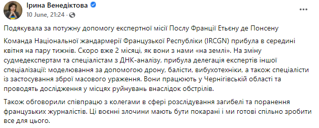 По ее словам, команда Национальной жандармерии Французской Республики (IRCGN) прибыла в Украину еще в середине апреля на пару недель, но задержались почти на два месяца.