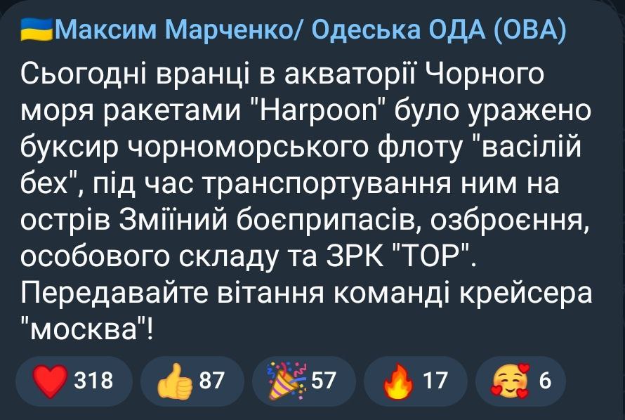 Российский буксир "Василий Бех" был поражен ракетой Harpoon с украинского побережья. Об этом сообщил глава одесской ОВА Максим Марченко.