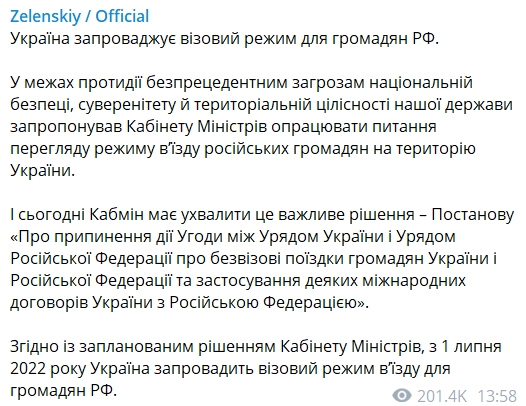 Позже президент Владимир Зеленский поддержал петицию о введении в Украине визового режима для граждан России и поручил премьер-министру проработать вопрос.