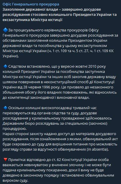 По версии следствия, в сентябре-октябре 2010 года Янукович захватил власть путем возвращения действия Конституции от 28 июня 1996 года. Это позволило увеличить объем власти президента, а роль парламента сузить.