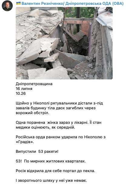 В Никополе Днепропетровской области после ракетного удара из-под завалов достали тела двух убитых людей. Об этом заявил глава ОВА Валентин Резниченко у себя на странице в Telegram.