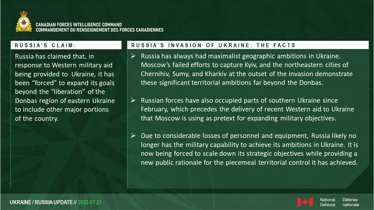 Российские силы оккупировали часть юга Украины с февраля, что предшествует недавней доставке западной помощи Украине, которую Москва использует в качестве предлога для расширения военных целей, напоминают в Вооруженных силах Канады.