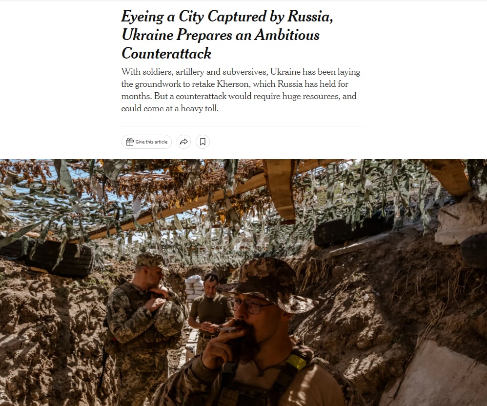 08:20 Украинское контрнаступление на Херсон "потребует огромных ресурсов и может привести к тяжелым потерям". Об этом пишет New York Times в своем аналитическом материале.
