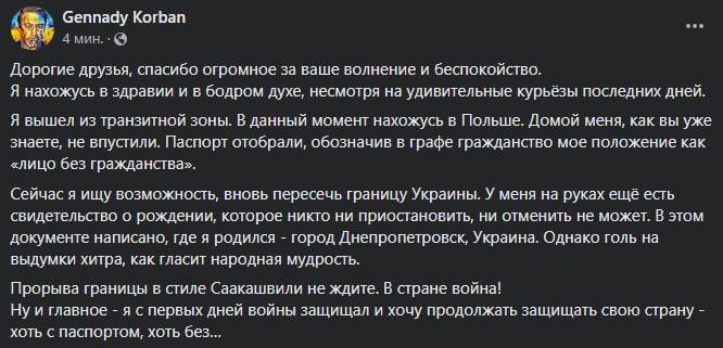 "Сейчас я ищу возможность, вновь пересечь границу Украины. У меня на руках ещё есть свидетельство о рождении, которое никто ни приостановить, ни отменить не может. В этом документе написано, где я родился - город Днепропетровск, Украина. Однако голь на выдумки хитра, как гласит народная мудрость. Прорыва границы в стиле Саакашвили не ждите. В стране война!" - написал Корбан.