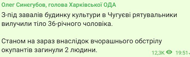 В Чугуеве спасатели продолжают разбирать последствия вчерашних разрушений дома культуры, где в подвале еще остались люди, сообщил губернатор Олег Синегубов.
