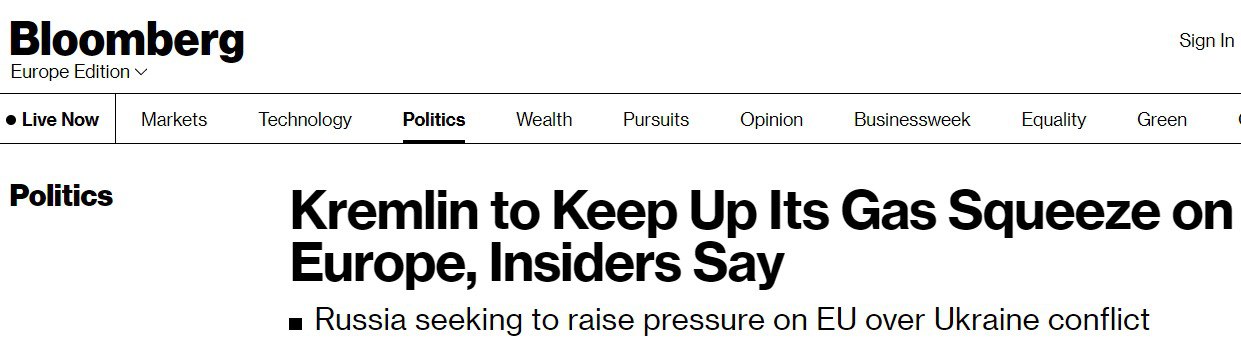 20:41 Кремль будет держать поставки газа в Европу на минимуме, пока ЕС не отменит санкции.