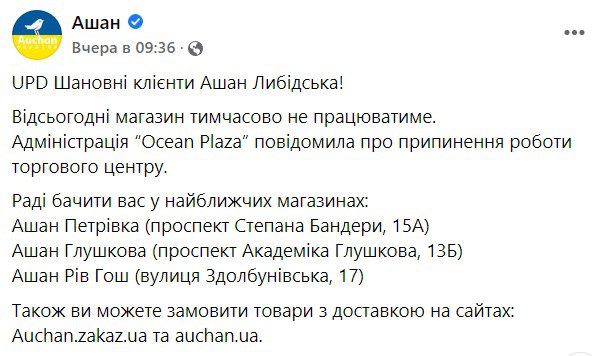 После 24 февраля в Ocean Plaza работал только нулевой этаж ТРЦ, где размещались супермаркет "Ашан" и еще несколько магазинов. Однако с 25 июля закрыт и он.