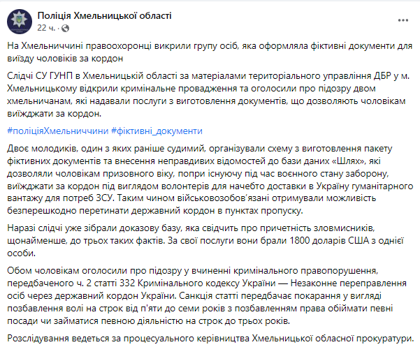 Полиция Хмельницкой области сообщает, что двое мужчин помогали уклонистам выезжать из Украины. Фото: из открытых источников