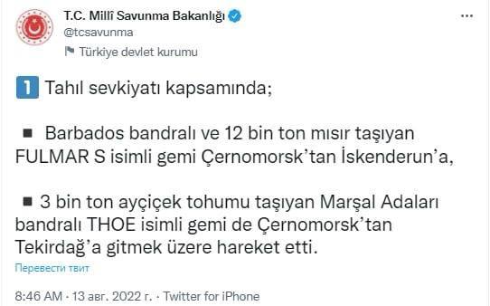 10:53 Еще два судна с украинской сельскохозяйственной продукцией вышло из порта Черноморск. Об этом сообщает у себя в твиттере Министерство обороны Турции.
