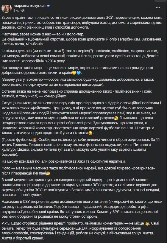 "В такой сети используется синхронно единый подход — разъединение военно-политического руководства государства и замену понятий: ВСУ по отдельности, а политическое руководство по отдельности, чтобы успехи ВСУ не связывать с Верховным Главнокомандующим, а вот все неудачи, наоборот, связывать. Присылаю в СБУ обращение об исследовании этого вопроса (и "сети") как несущего угрозу национальной безопасности. Подобные явления – идеальный плацдарм для работы России по внутренней дестабилизации страны", - пишет Безуглая в Facebook.