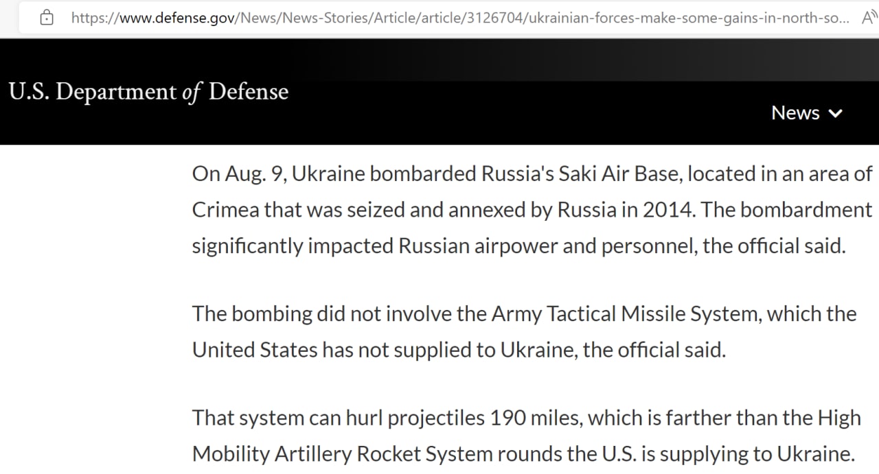Со ссылкой на неназванного официального представителя военного ведомства США говорится, что "9 августа Украина обстреляла российскую авиабазу Саки, расположенную в Крыму, который был захвачен и аннексирован Россией в 2014 году".