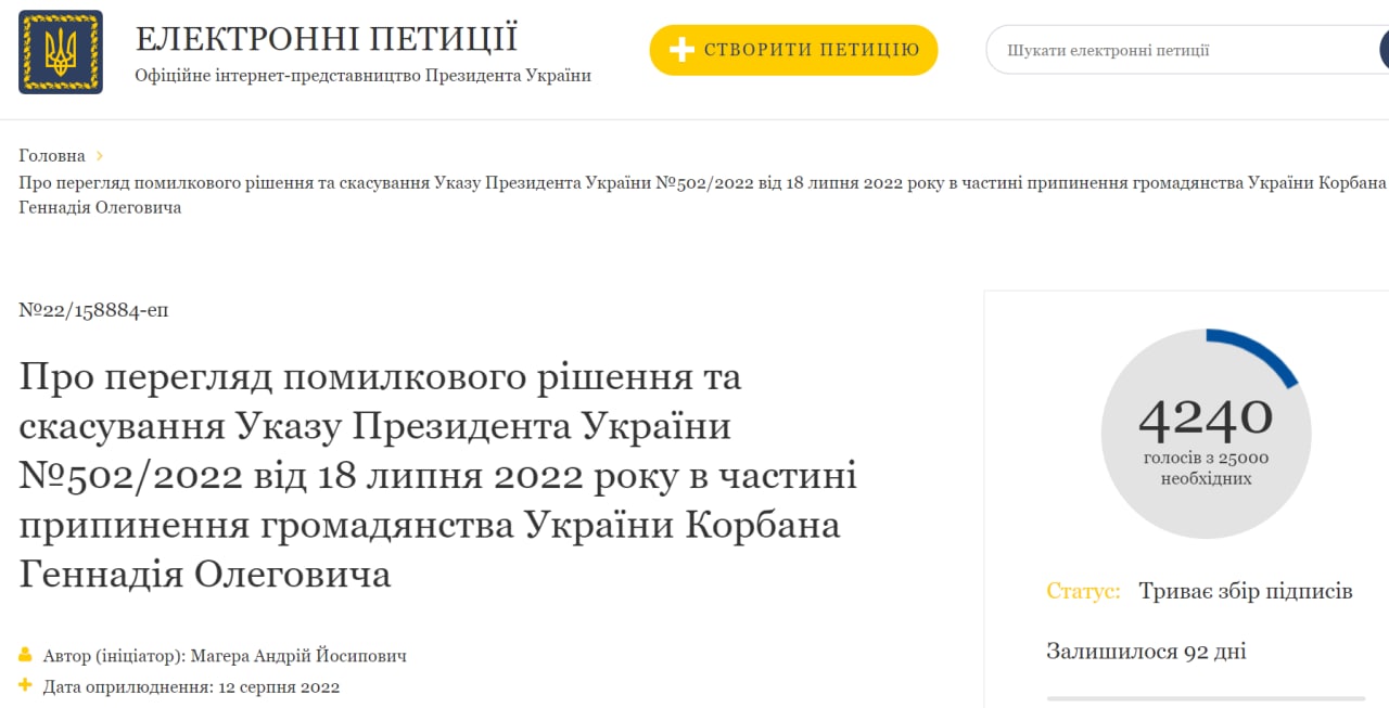Автор - бывший заместитель главы ЦИК Андрей Магера - просит отменить указ президента №502/2022 от 18 июля в части лишения Корбана украинского паспорта.