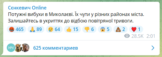 Мэр Николаева Александр Сенкевич уточнил, что взрывы во время ночной вражеской атаки города были слышны в разных районах города. На местах попаданий работали соответствующие службы.