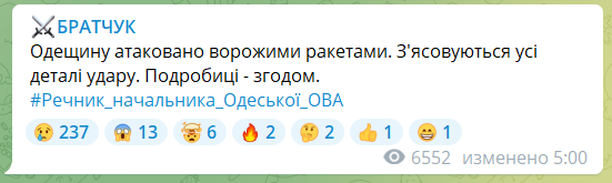 Как сообщил в Telegram-канале спикер Одесской ОВА, детали удара по Одесской области уточняются.
