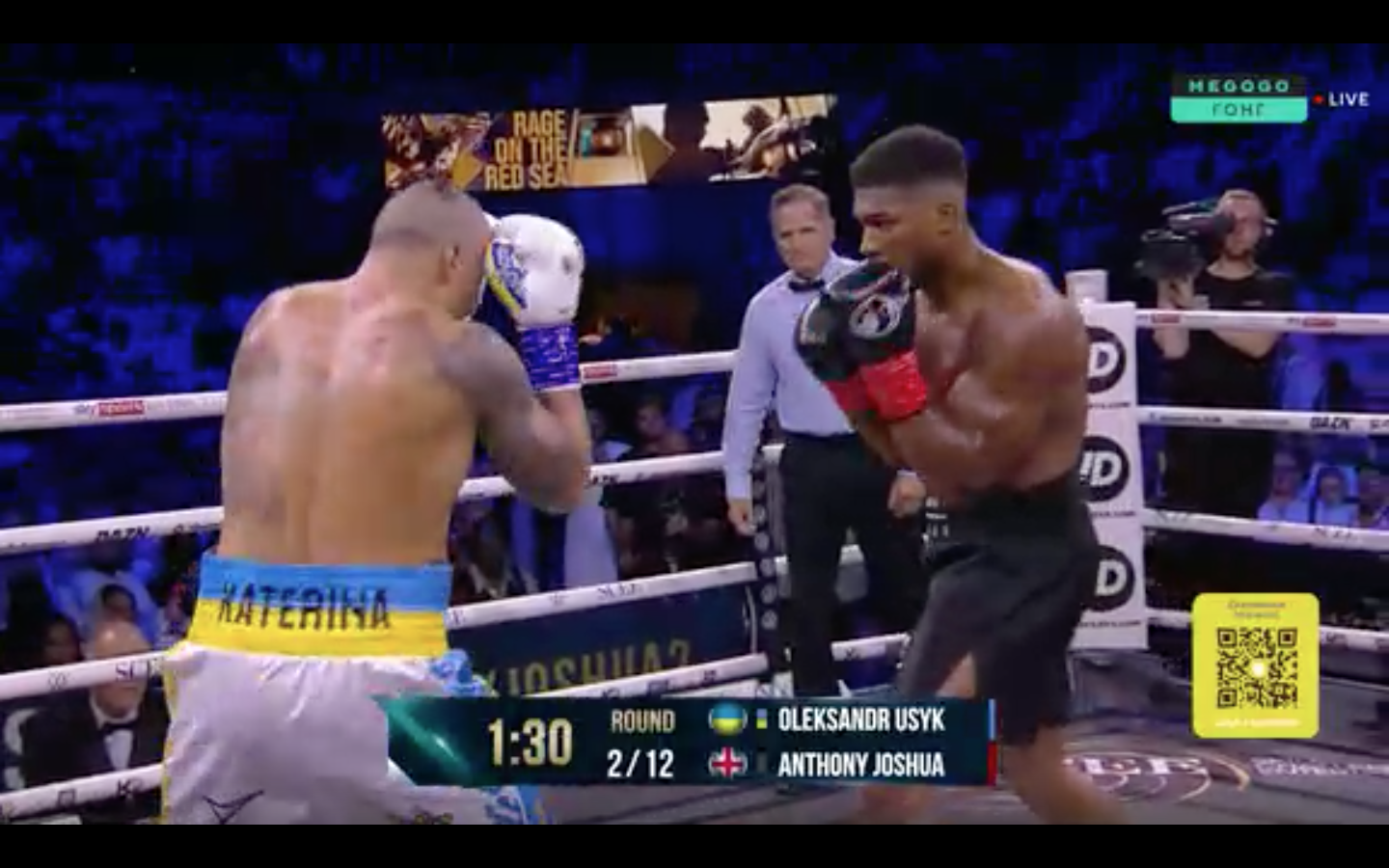 01:31 Пятый раунд, оба спортсмена прибавили в скорости. Джошуа ударил Усика в пах, бой приостановлен.
