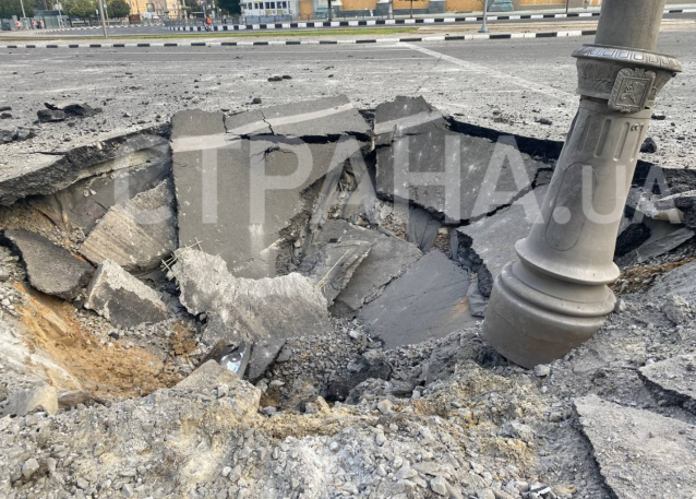 Одна из пущенных сегодня по Харькову ракет приземлилась в асфальт около жилого дома на Павловской площади.