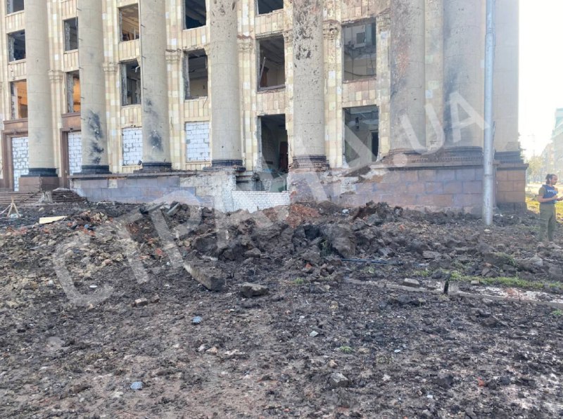 В результате вчерашнего удара по центру Харькова две ракеты приземлились рядом со зданием областной администрации (сзади и спереди).