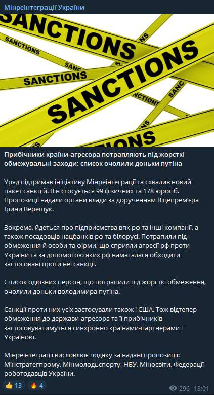 В частности, речь идет о предприятиях военно-промышленного комплекса РФ и других компаний, а также должностных лиц нацбанков России и Беларуси. Попали под ограничения лица и фирмы, способствовавшие агрессии России против Украины и с помощью которых Россия пыталась обходить примененные против нее санкции.