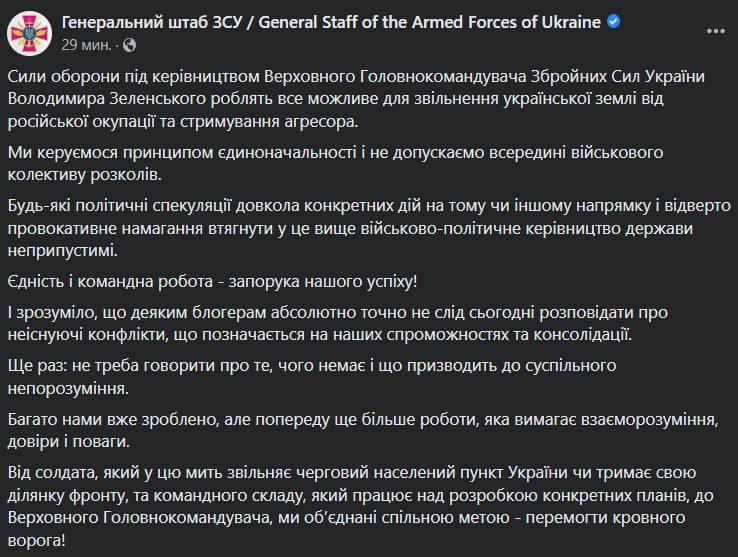 В Генштабе ВСУ резко осудили политические спекуляции вокруг военных действий и "откровенно провокативные попытки втянуть в это высшее военно-политическое руководство".