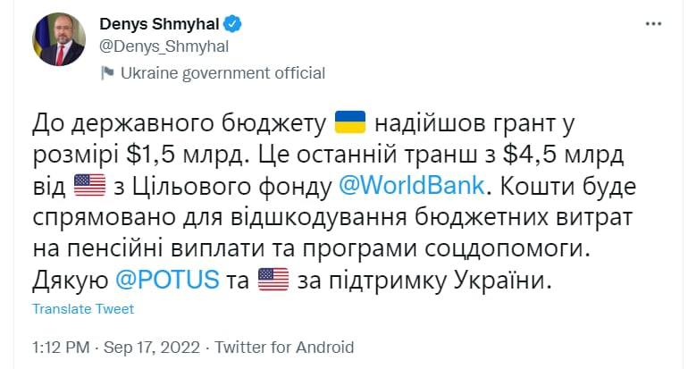 "Это последний транш из 4,5 миллиарда долларов от США из Целевого фонда Мирового банка. Средства будут направлены для возмещения бюджетных затрат на пенсионные выплаты и программы соцпомощи", - пишет Шмыгаль.