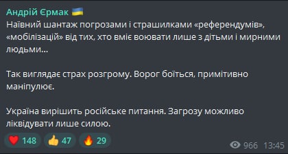 "Наивный шантаж угрозами и страшилками "референдумов", "мобилизаций" от умеющих воевать только с детьми и мирными людьми. Так выглядит страх разгрома. Враг боится, примитивно манипулирует. Украина решит российский вопрос. Угрозу можно ликвидировать только силой", - написал Ермак.
