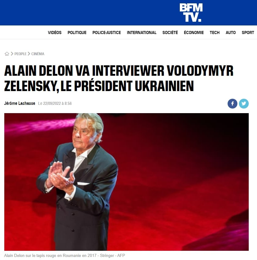 Известный французский актер Ален Делон проведет интервью с Владимиром Зеленским. Об этом сообщает французский телеканал BFMTV.