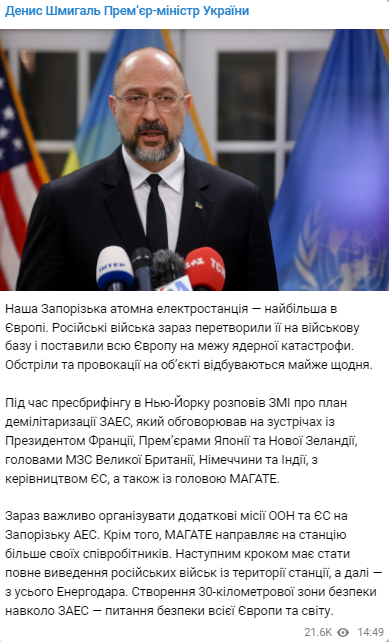 По словам Шмыгаля, украинское правительство также работает над тем, чтобы организовать международные миссии ООН и ЕС на Запорожскую АЭС.