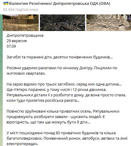 Днепр после обстрела ночью 29 сентября