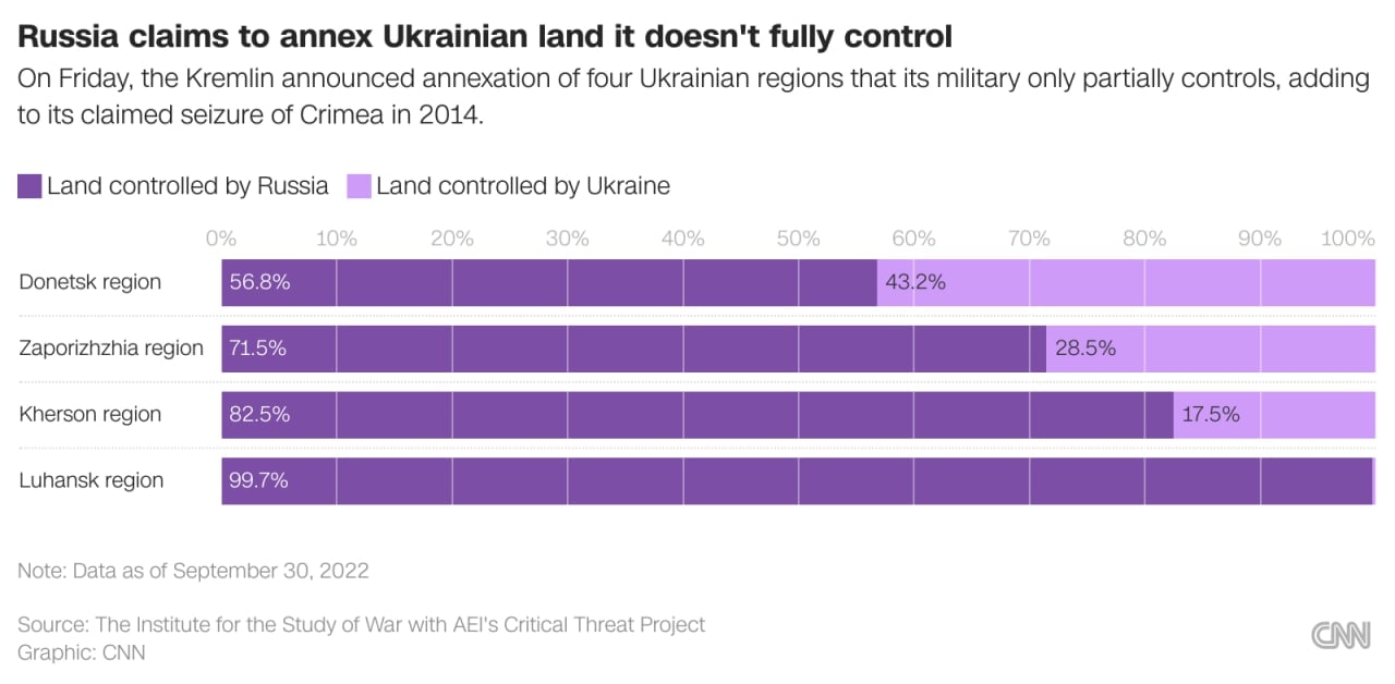 09:03 Агентство CNN посчитало, какой процент территории в областях Украины, об аннексии которых объявили в РФ, находится под российским и украинским контролем (по состоянию на 30 сентября).