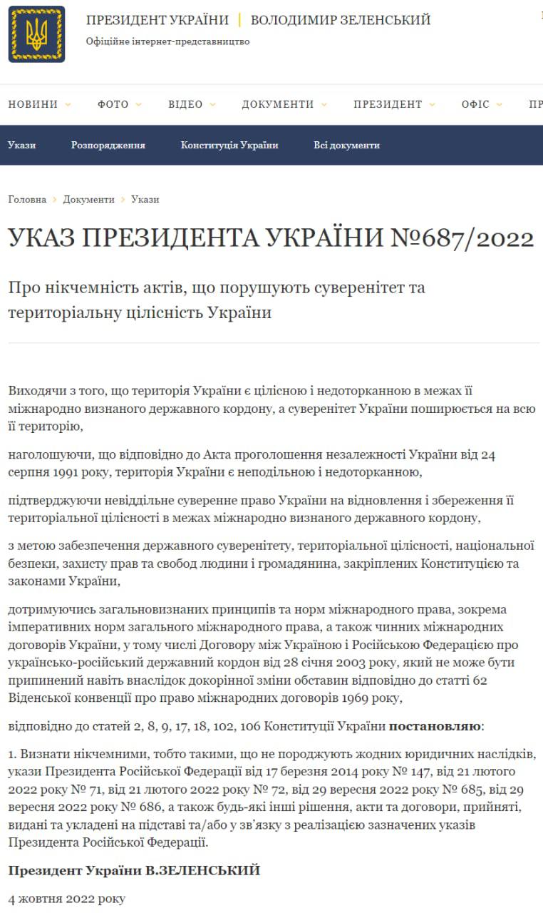 - Сообщил о своем указе, которым признаются никчемными все указы президента РФ в отношении украинских территорий.