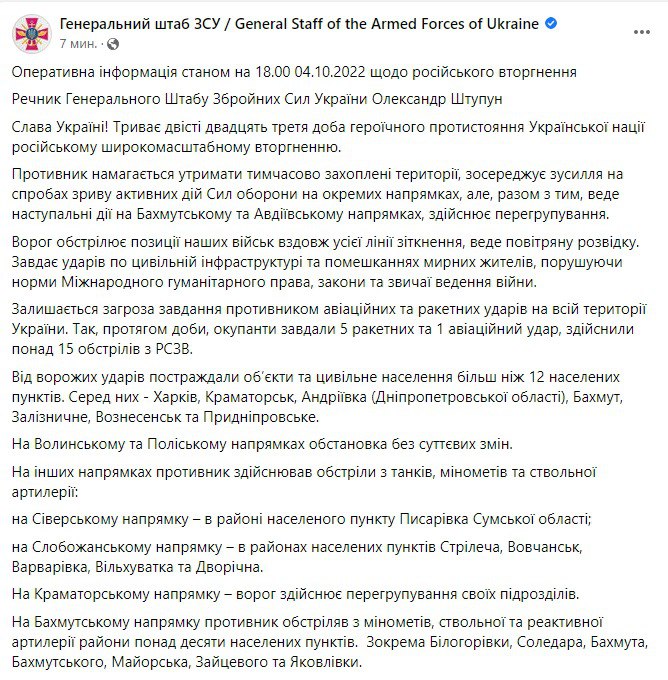07:09 Сводка Генштаба ВСУ на утро 4 октября.