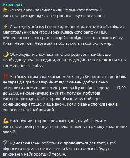 "В связи с этим призываем жителей Киевщины и регионов, где сейчас действует график аварийных отключений, добровольно снизить потребление электроэнергии в вечерние часы – с 17:00 до 22:00. Рекомендуем включать мощные бытовые электроприборы, такие как стиральные машины, бойлеры, кондиционеры и т.д., только ночью, когда уровень потребления в энергосистеме самый низкий", - говорится в сообщении.