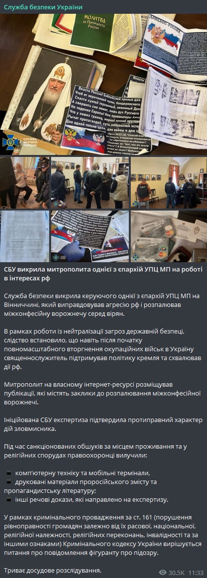 В пресс-службе СБУ сообщают, что "управляющий одной из епархий УПЦ в Винницкой области" оправдывал агрессию РФ и разжигал межконфессиональную вражду между верующими, размещая на "собственном интернет-ресурсе" публикации с призывами к вражде.