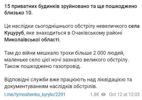 В Николаевской области под обстрел попало село Куцуруб. Там разрушены 15 частных домов, еще 10 - повреждены.