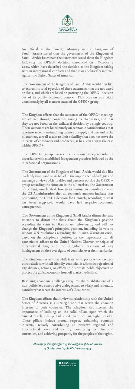 Министерство иностранных дел Саудовской Аравии заявило, что решение ОПЕК+ о сокращении добычи нефти было "чисто экономическим". В МИД королевства отрицают, что оно было "политически мотивировано против Соединенных Штатов".