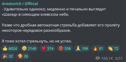 "Удивительно одиноко, медленно и печально выглядит "Шахед" в сияющем киевском небе. Разве что дробная автоматная стрельба добавляет его пролёту некоторое нерядовое разнообразие. Я тоже хотел стрельнуть, но не успел", - написал он.