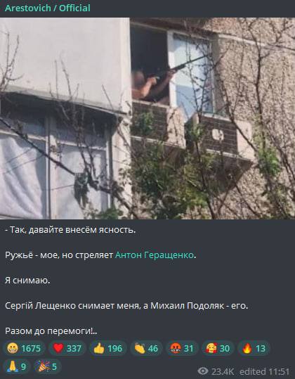 "Так, давайте внесём ясность. Ружьё - мое, но стреляет Антон Геращенко. Я снимаю. Сергей Лещенко снимает меня, а Михаил Подоляк - его. Разом до перемоги!" - написал он.