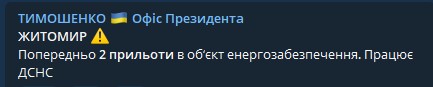 "Житомир. Предварительно два прилета в объект энергообеспечения", - написал он.
