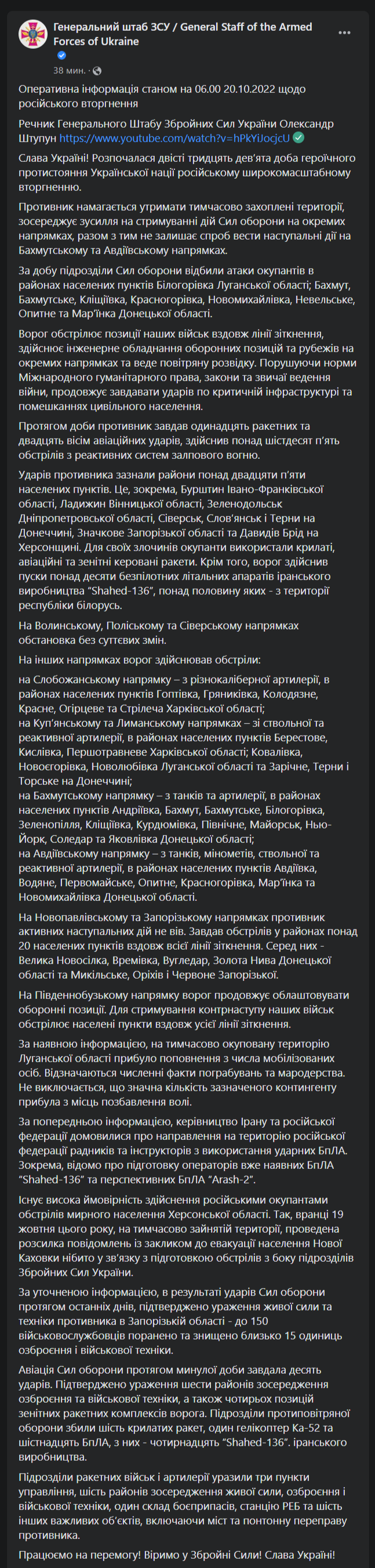 По информации Генштаба, россияне нанесли 11 ракетных и 28 авиаударов. Среди наиболее пострадавших населенных пунктов - Бурштын в Ивано-Франковской области, Ладыжин в Винницкой и Зеленодольск в Днепропетровской. Во всех трёх находятся крупные электростанции.