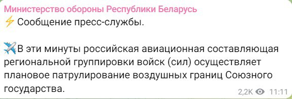 Минобороны Беларуси заявляет, что российская авиация в эти минуты "осуществляет плановое патрулирование воздушных границ Союзного государства".