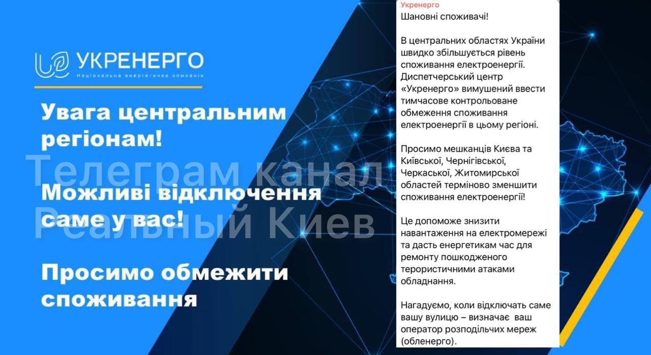 "Просим жителей Киева и Киевской, Черниговской, Черкасской, Житомирской областей срочно снизить потребление электроэнергии! Это поможет снизить нагрузку на электросети и даст энергетикам время для ремонта поврежденного террористическими атаками оборудования", - заявили в "Укрэнерго".