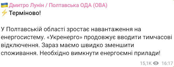 О том, что Полтавская область находится на грани веерных отключений, также сообщал губернатор Дмитрий Лунин. Он призывает срочно выключить энергоемкие приборы.