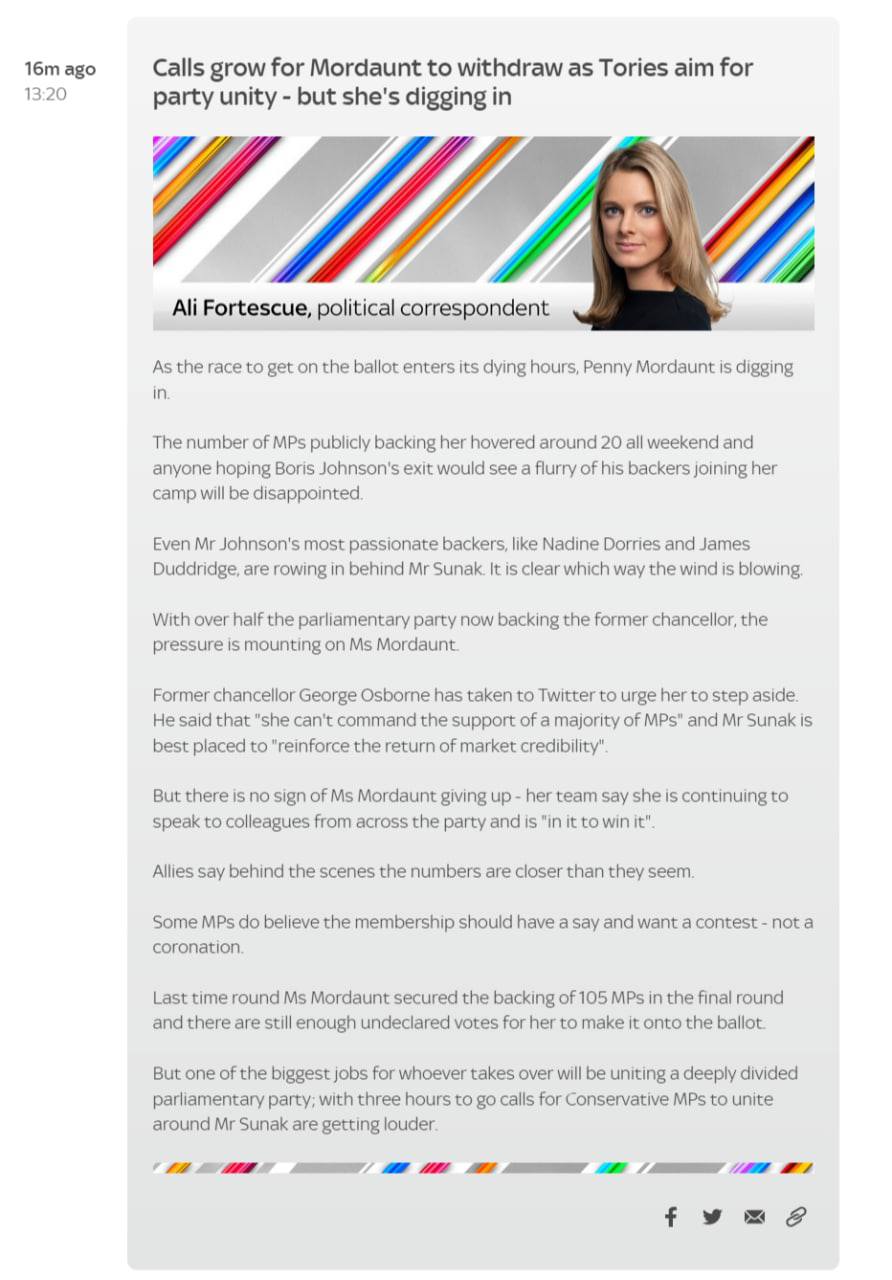 Однако команда другого претендента на пост премьера Пенни Мордонт говорит, что она "продолжает общаться с коллегами со всей партии и стремится к победе", пишет Sky News.