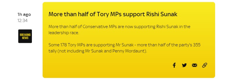 Кандидатуру бывшего главы Министерства финансов Британии Риши Сунака на пост главы Консервативной партии и премьер-министра Великобритании поддержало больше половины членов парламентской фракции консерваторов.